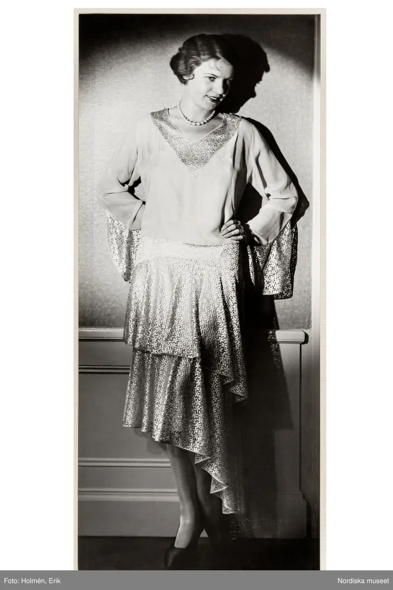 Mannekäng visar klänning med lång ärm och kjolen i flera lager volanger, framtill vadlång och bak hellång. Drapering vid ärmar. Pärlcollier. NK:s Franska damskrädderi.