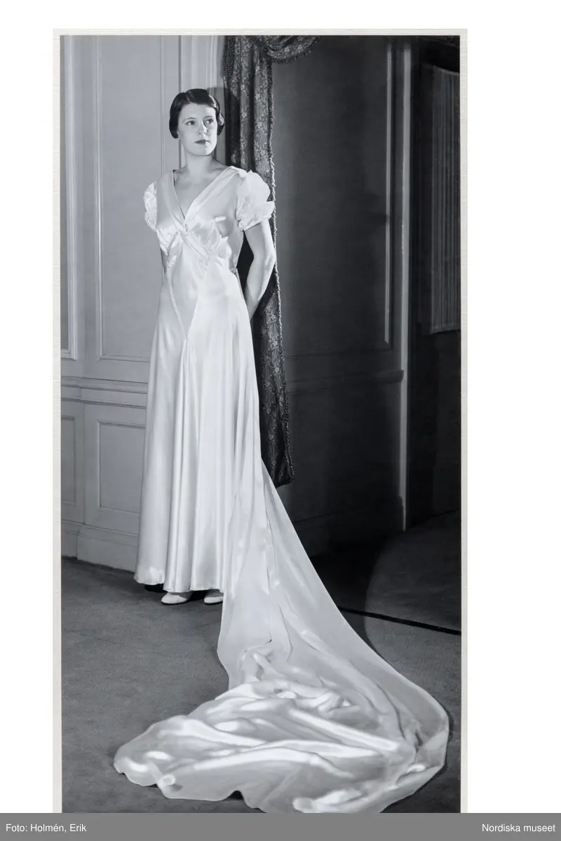 Mannekäng visar galaklänning, troligen hovdräkt, med kort gallerärm, v-ringad med insydd kil under bysten. Hellång kjol sydd på skrådd och långt släp. NK:s Franska damskrädderi.
