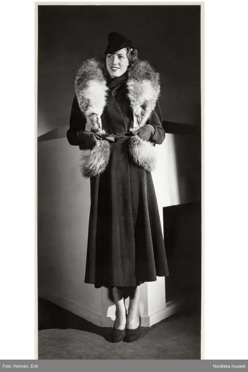 Mannekäng visar kappa. Vadlång kappa, omlottknäppt med skärp och mjukt veckad nederdel. Liten hatt, pumps och pälsboa över axlarna. NK:s Franska damskrädderi.