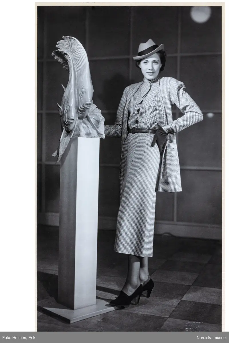 Mannekäng visar dräkt. Skjortklänning med knäppt liv, skärp i midjan och vadlång pennkjol. Kavaj, stusslång med markerade axlar, allt i smårutigt tyg. Hatt, handskar och pumps. NK:s Franska damskrädderi. På ett podium står en skulptur i form av fiskar.