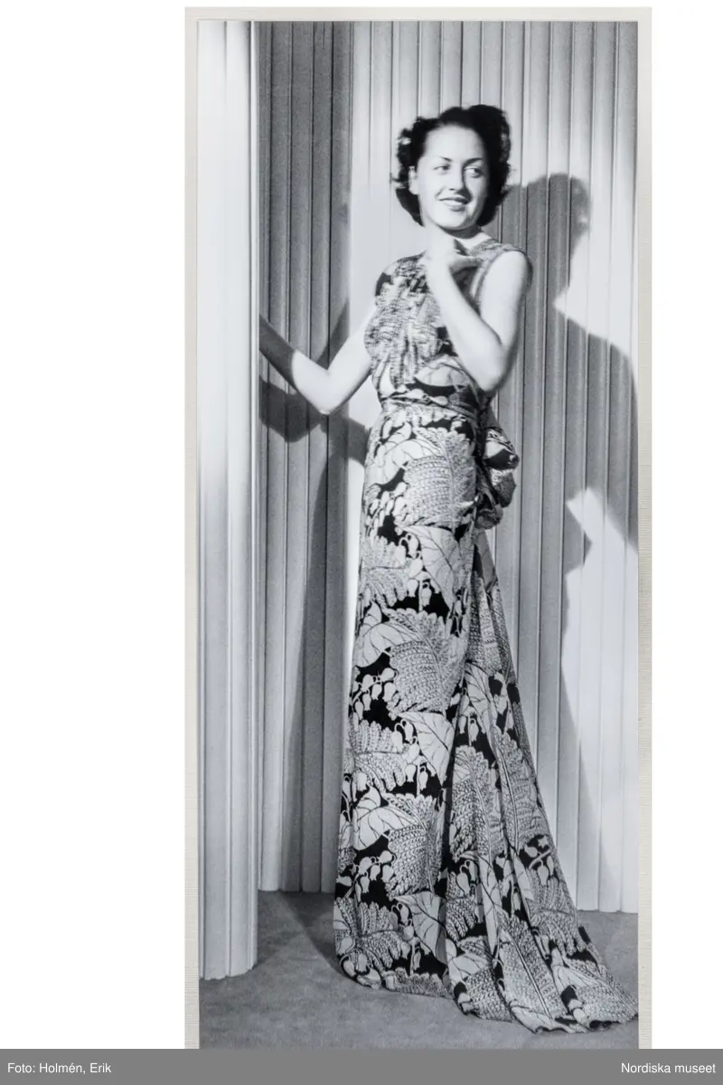 Mannekäng visar festplagg. Aftonklänning med rund hals, utan ärm, hellång kjol med rak silhuett, baktill drapering och litet släp. Stort bladmönster. NK:s Franska damskrädderi.