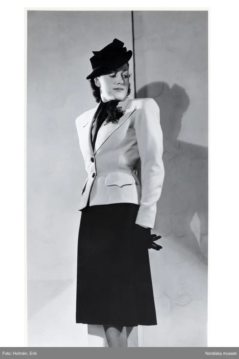 Mannekäng visar dräkt. Höftlång jacka med insvängd midja och ficklock. Vadlång, lätt utställd kjol. Liten hatt, handskar och corsage på ena slaget. NK:s Franska damskrädderi.