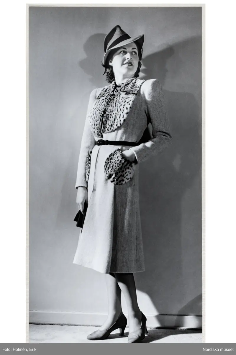 Mannekäng visar plagg i provrum. Kappa, figursydd, vadlång och med markerade axlar. Fläckig kattdjurspäls på krage och fickor. Hatt och pumps. NK:s Franska damskrädderi.