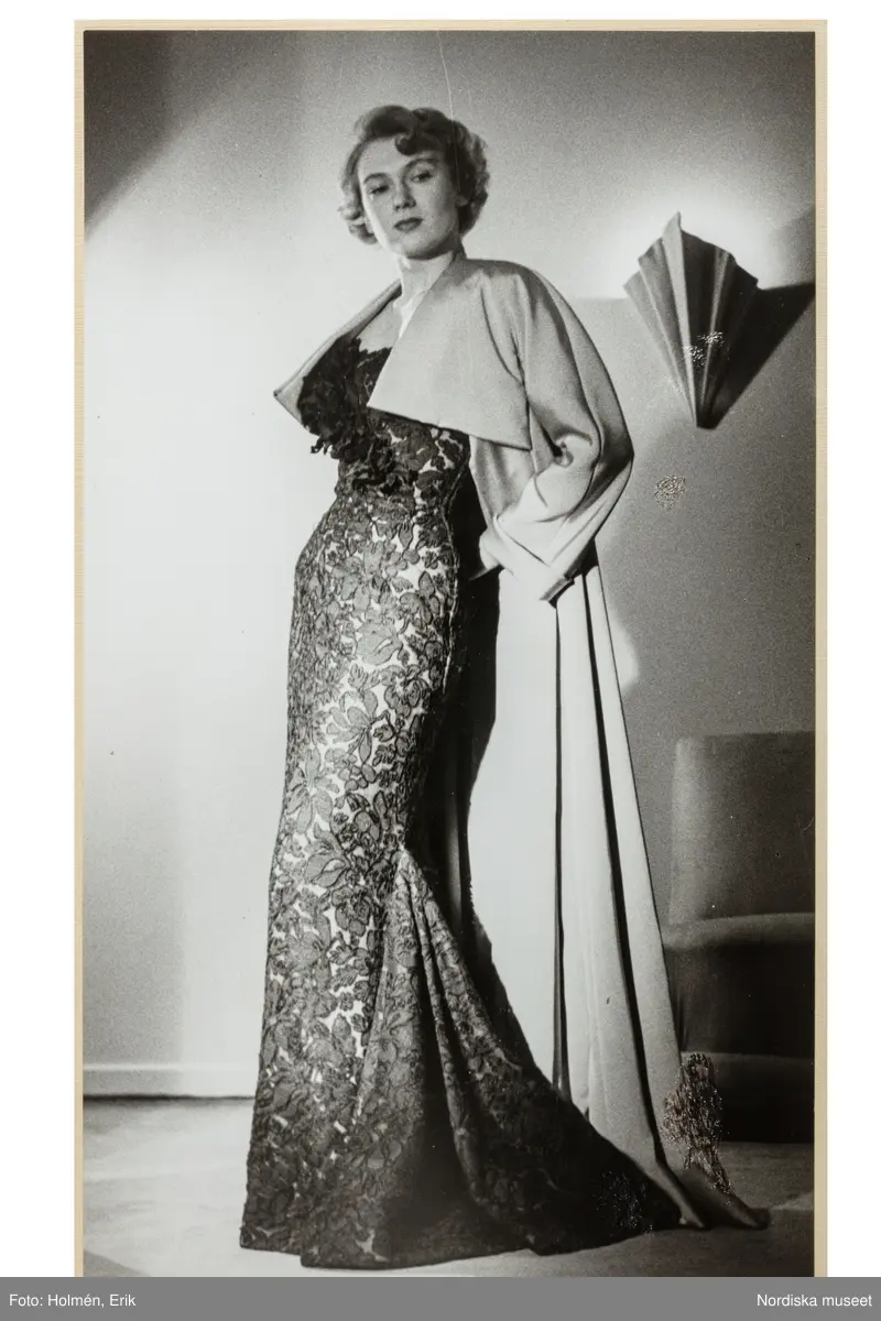 Mannekäng visar festplagg i provrummet. Hellång blommönstrad aftonklänning, figurnära, men från knäet vidd. Vid bysten dekor. Över bär kvinnan en öppen, hellång kappa med tungt fall. NK:s Franska damskrädderi.