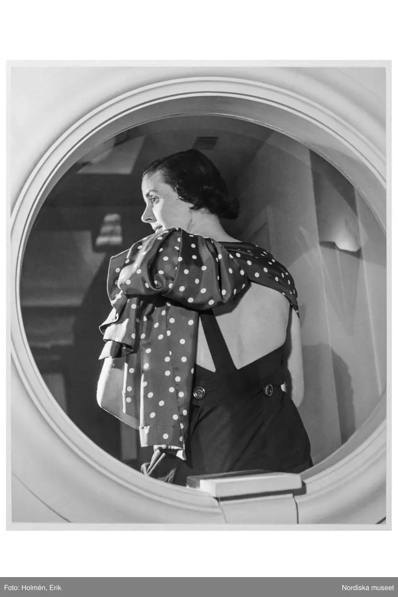 Mannekäng visar plagg i provrummet, sedd genom runt fönster. Urringad klänning med ryggen i fokus. Över axlarna en prickig sjal draperad. NK:s Franska damskrädderi.
