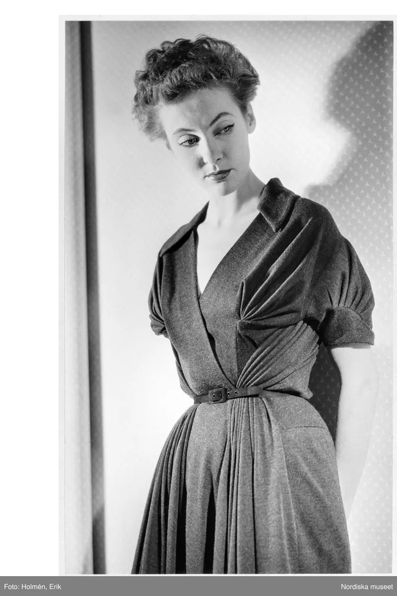 Mannekäng visar plagg på NK:s Franska damskrädderi. Klänning med omlottskuret liv och liten krage, kort puffärm och vadlång kjol. Intrikat sömnad med rynkor och draperingar, smalt skärp i midjan. Se även helfigursbild av klänningen NMA.0099942.