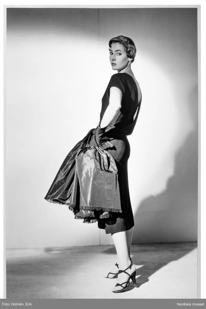 Mannekäng visar plagg i provrummet vid NK:s Franska damskrädderi. Knälång klänning med kort ärm och djupt ringad rygg. Handskar, bred sidensjal med fransar och remsandaletter.