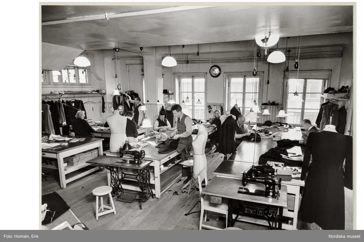 Beklädnadsateljéerna på NK (Nordiska Kompaniet). I lokalen arbetar både män och kvinnor med sömnadsarbeten vid långa bord. I förgrunden står två symaskiner.