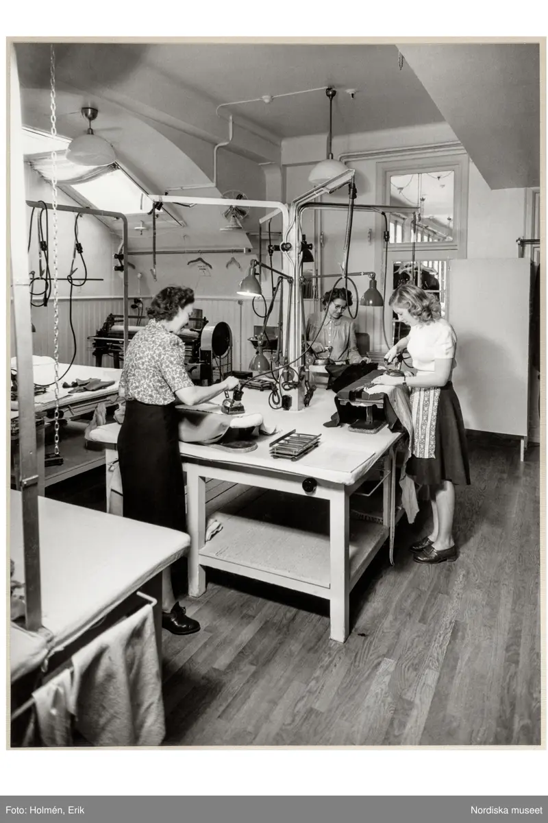 Beklädnadsateljéerna på NK (Nordiska Kompaniet). Tre kvinnor står vid ett bord och stryker, pressar tillklippta tygdelar.
