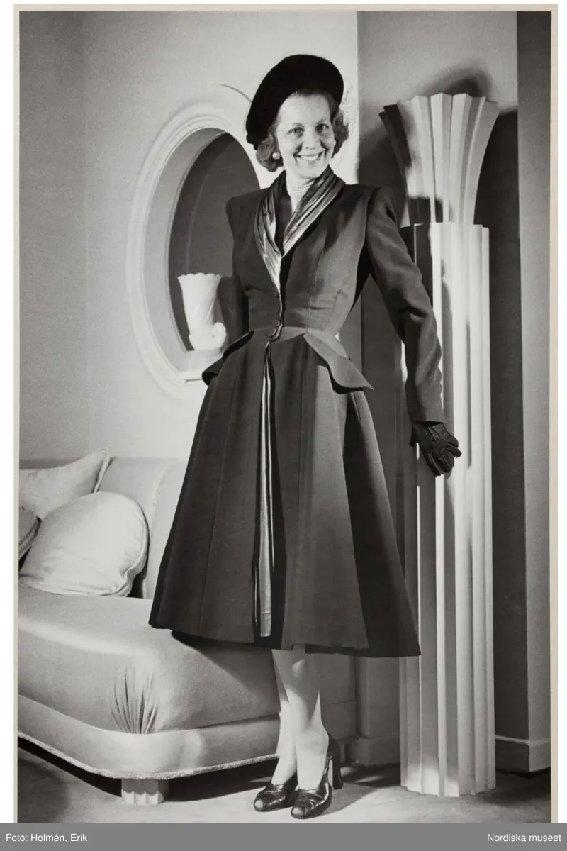 Mannekäng, fru Ulla Holmquist, visar kappa. Figursydd vadlång, utställd kappa med slag i avvikande tyg, stora ficklock. På huvudet barett. NK:s Franska damskrädderi.