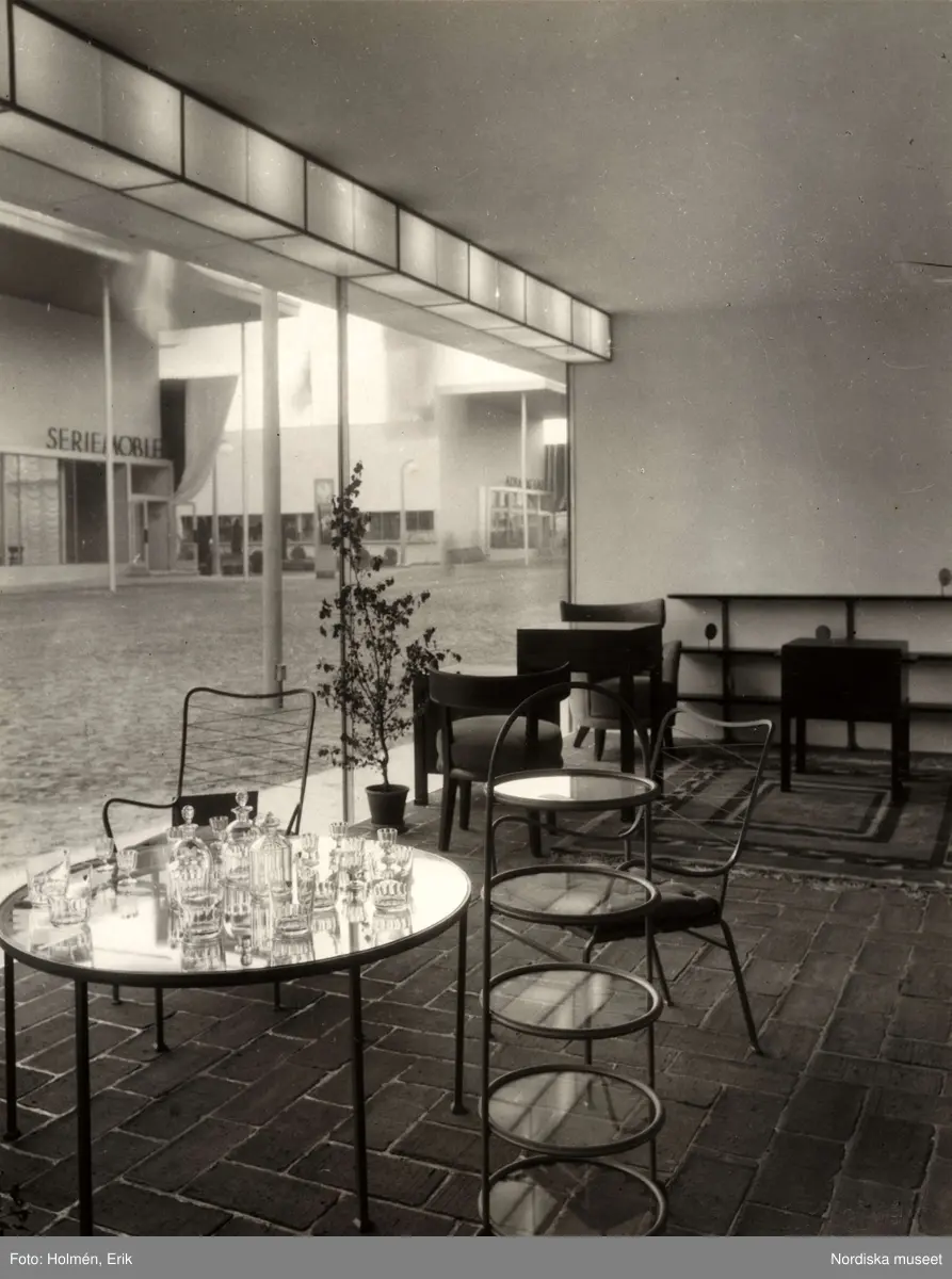 Interiör från Stockholmsutställningen 1930 med möbler från Nordiska Kompaniet. Ett runt bord och ett avlastningsbord i flera etager, båda av stålrör med glasskivor. På bordet står en grupp slipade glas och karaffer. Intill står två karmstolar av stålrör med stoppade dynor. I bakgrunden ses en del av utställningsområdet