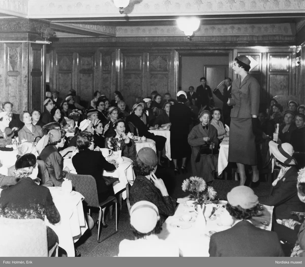 Modell står på ett podie, klädd i mörk dräkt, svarta handskar, hatt och svarta pumps. Modellen håller en skylt i handen. Publiken sitter vid uppdukade bord med vita dukar, NK-servis och blommor i vas. De flesta kvinnorna i publiken bär hatt.