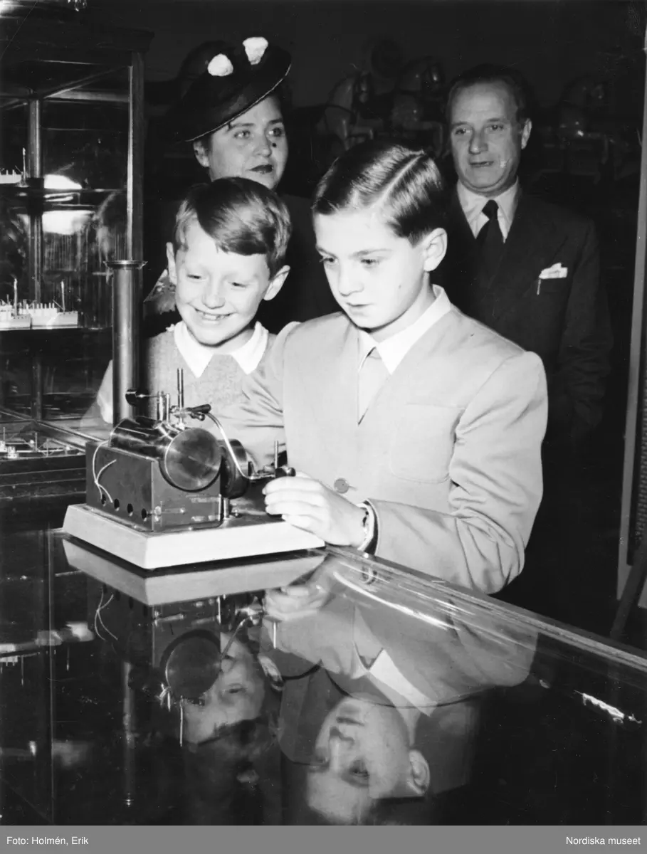 Pianisten Pierino Gamba på besök på Nordiska Kompaniet. Gamba står vid disken, klädd i ljus kavaj. Bredvid står en pojke i vit pikétröja och pullover. Bakom pojkarna står en man och en kvinna. Kvinnan bär hatt med flor.