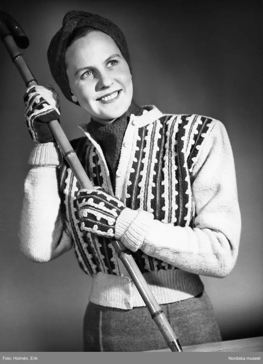 Mode från Nordiska Kompaniet. Modell i stickad kofta (så kallad Bohusstickning), kjol, halsduk, jersey-turban och vantar håller i en käpp.