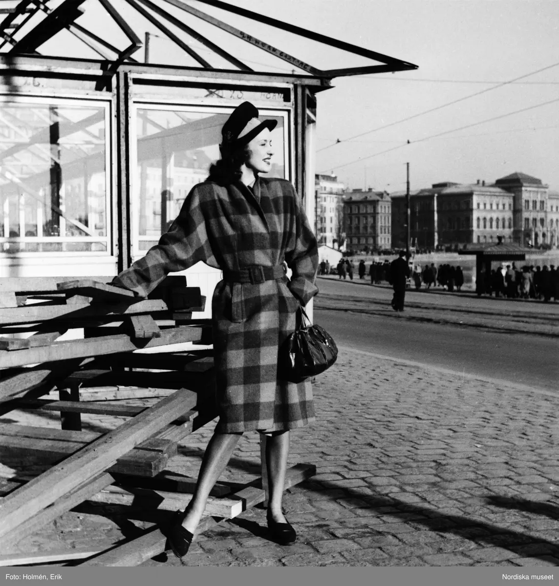 Stilfotografering. Modell i rutig kappa med skärp, lågskor, handväska och hatt. Modellen står i solen och tittar ut över Strömkajen, Stockholm.