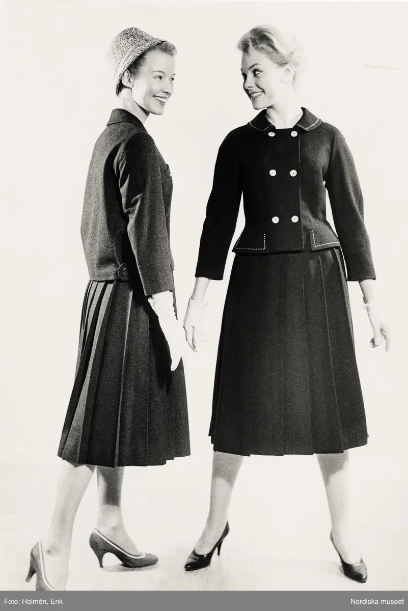 Två modeller klädda i dräkt. Modellen till vänster bär dräkt i grå flanell, rak jacka och helveckad kjol, ljusa handskar, pumps och hatt. Fougstedt. 145 SEK. Modellen till höger bär dräkt i marin, 100% kamgarn, vita stickningar, helveckad kjol, ljusa handskar och pumps. Wallengren. 210 SEK.