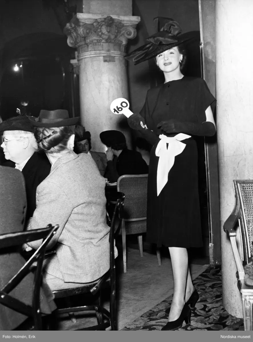 Modell, fröken Genberg, poserar i svart klänning med vitt skärp, långa handskar, hatt och pumps. I bakgrunden syns pelare och publik som sitter vid bord. Modellen håller en skylt i handen där det står 160. Röda Kors-fest på biografen Royal, Stockholm.
