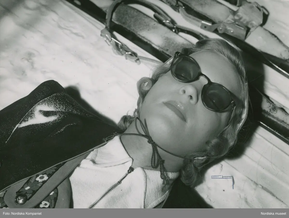 Kvinna i skidkläder och solglasögon ligger lutad mot en konstgjord snöig bakgrund. Bakom hennes huvud ett par skidor. Nordiska Kompaniet. Text med blyerts på baksidan: "Sport".