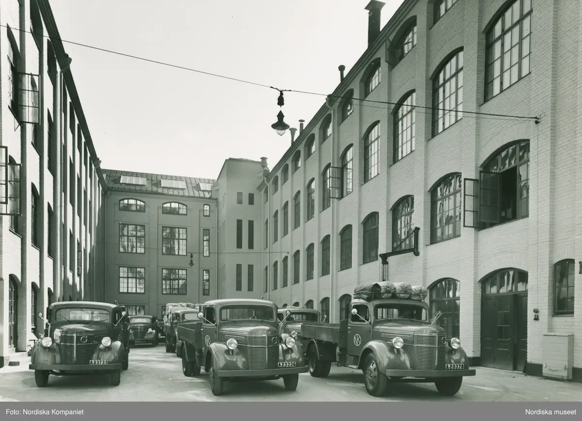 Parkerade Volvo-lastbilar med Nordiska Kompaniets varumärke på dörrarna. Text med blyerts på baksidan: NK:s nya lagerhus invid Stockholms stads slakthus i Enskede. 'Centrallager'. Sept. 1940".