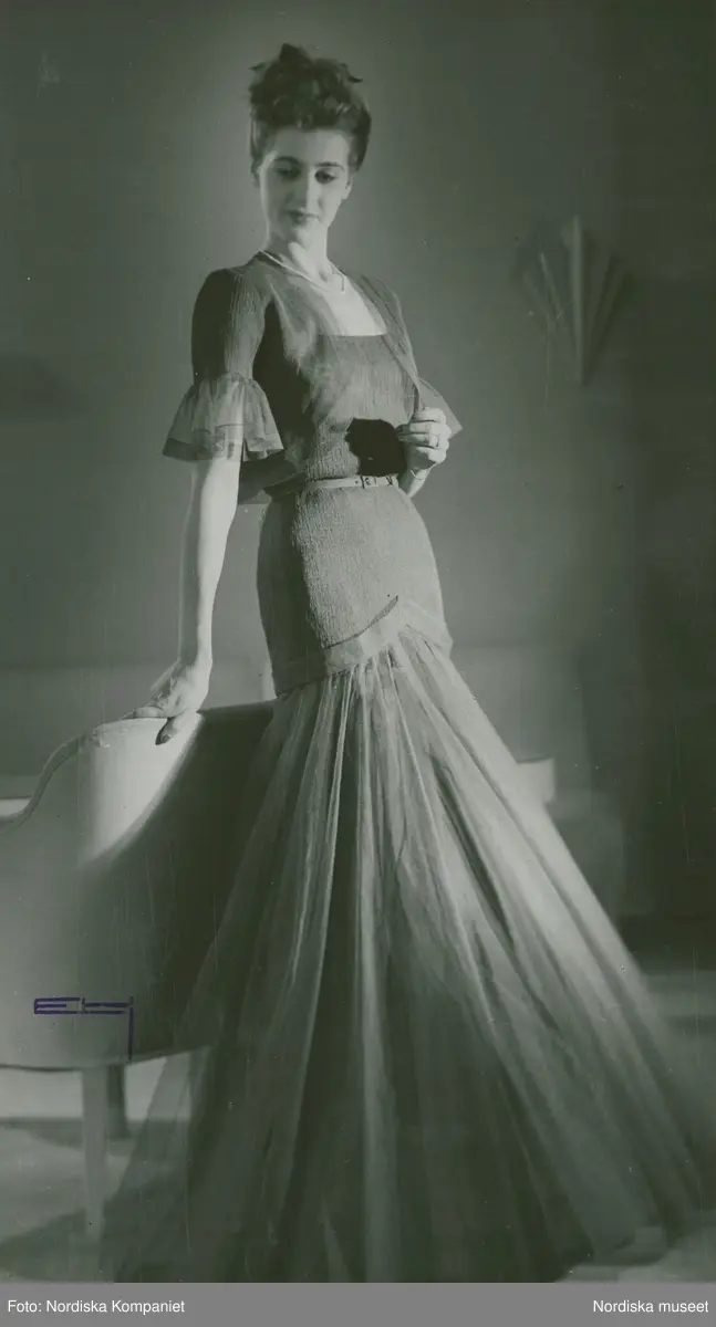 Modell i aftonklänning med kort jacka med volangärmar, kjol i tyll.