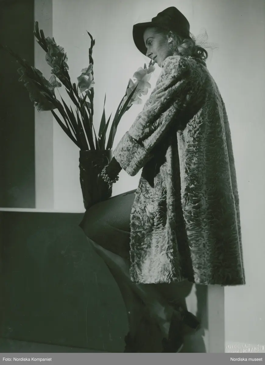 Modell i pälskappa, hatt med flor och armband vid en blomsterbukett.