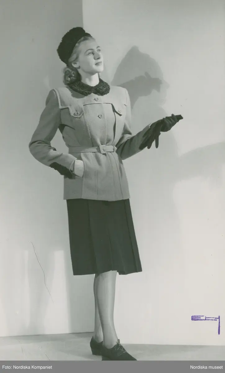 Modell i dräkt med pälskrage kosack-mössa, snörskor och handskar.