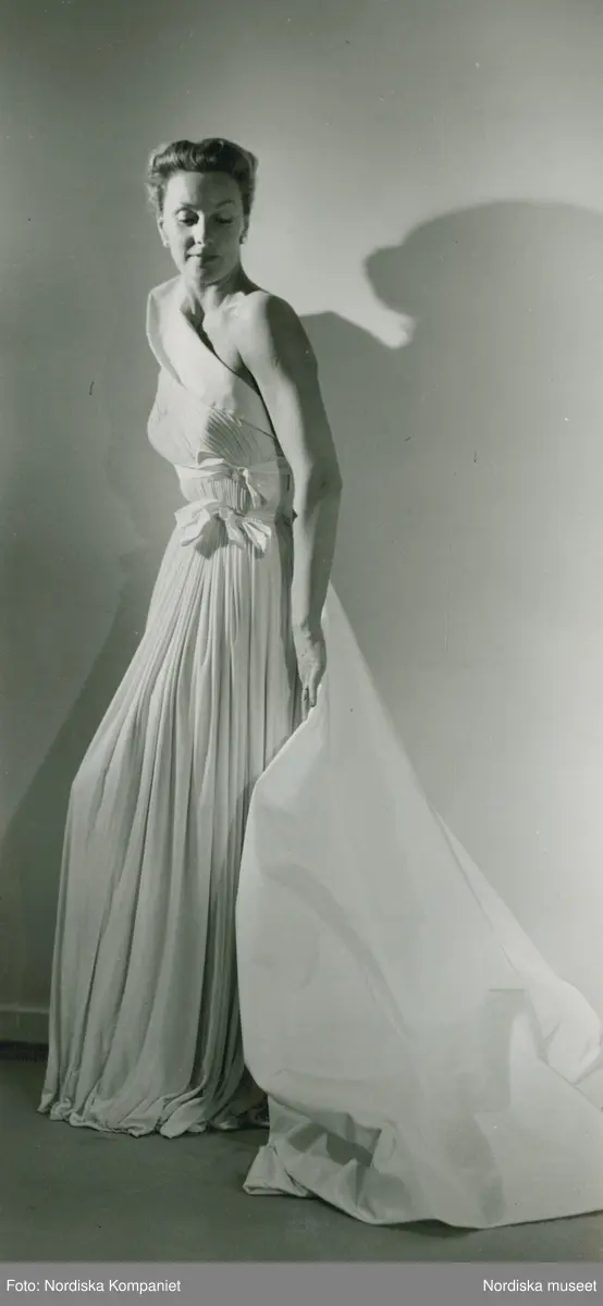 Modell i aftonklänning med släp och rosetter. NK:s Franska efter Madame Grès.