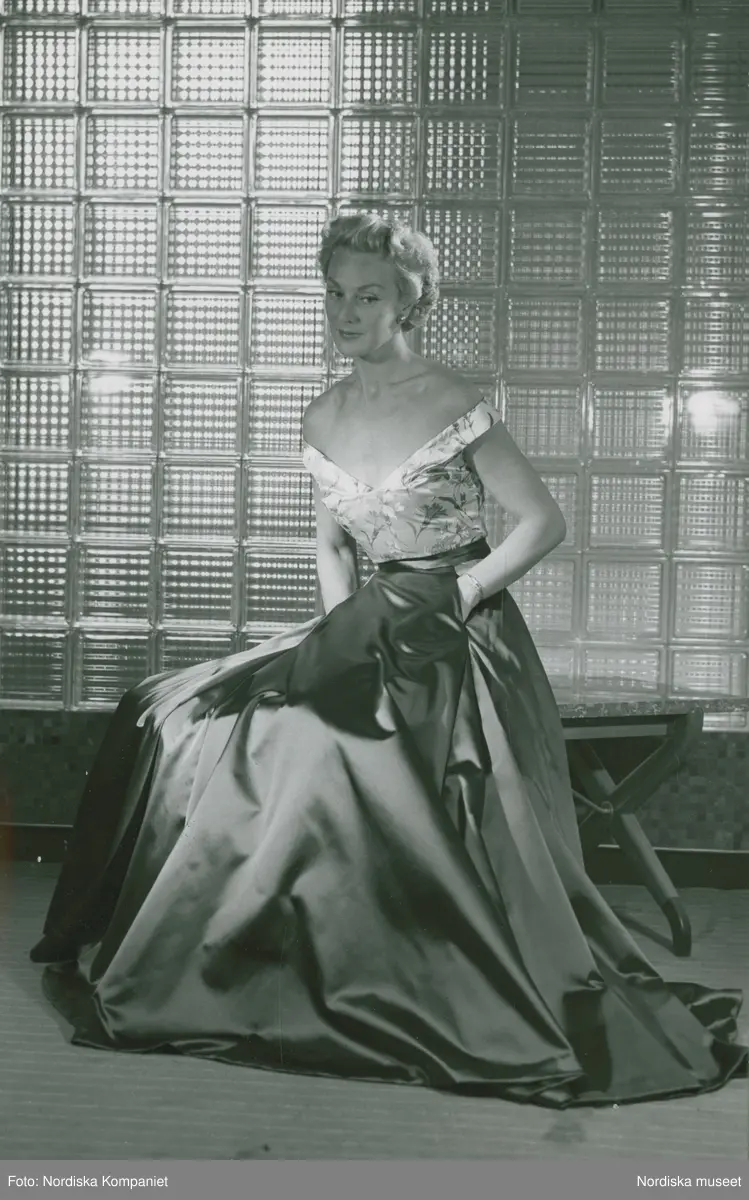 Modell i aftonklänning med blommig överdel och enfärgad kjol. Betongglas i bakgrunden.