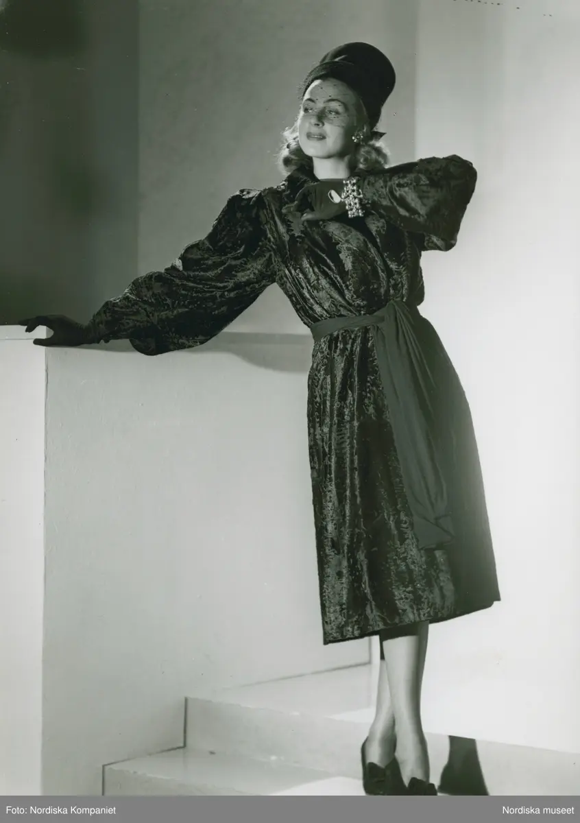 Modell i pälskappa med band i midjan, hatt med flor, handskar, armband och örhängen.