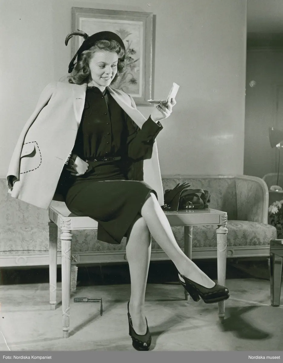 Modell i klänning och kavaj med kritstrecksränder runt fickorna, hatt med flor och fjädrar, samt skor med slingback och öppen tå, sitter på ett bord med en spegel i handen.