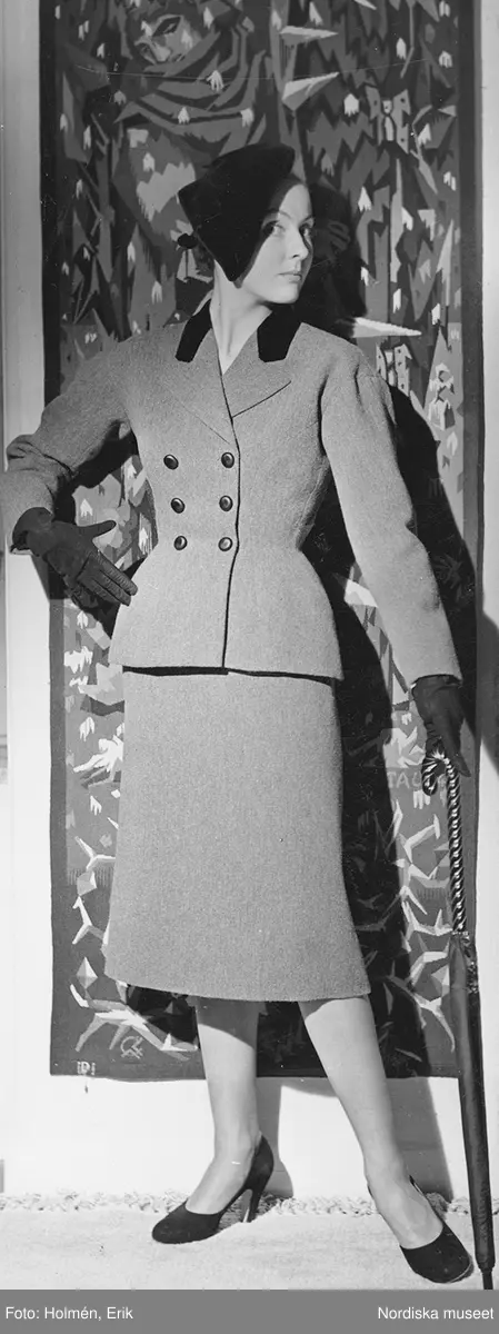 Modell i dräkt, hatt och pumps framför textilkonstverk.