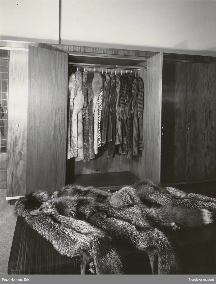 Nordiska Kompaniet. Interiör från NK:s pälsavdelning. På ett bord i förgrunden ligger skinn. I ett skåp i bakgrunden hänger pälsar på galgar. Text på baksidan: "Pälsavd. januari 1943".