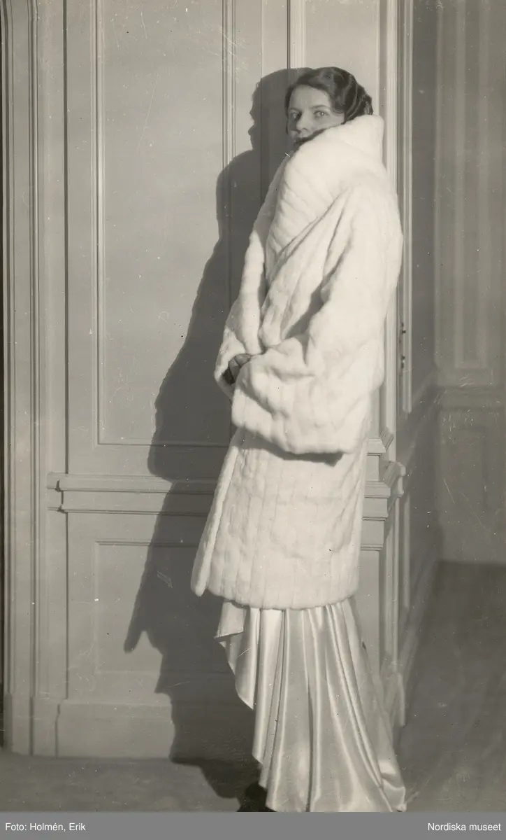 Nordiska Kompaniet. Kvinna i vit aftonklänning och vit pälskappa av hermelin. Hög, bred krage. Text på baksidan: "Hermelin fodrad med [---]. Wien."