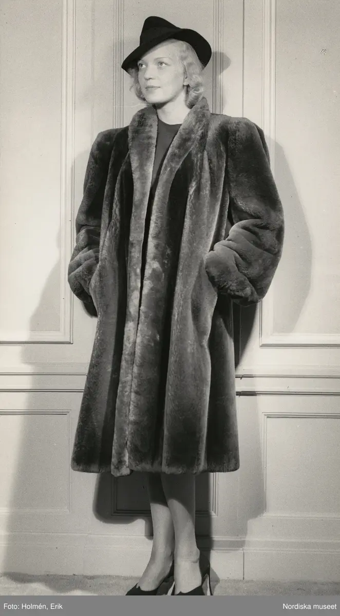 Nordiska Kompaniet. Kvinna i mörk pälskappa med sjalkrage. Mörk hatt.