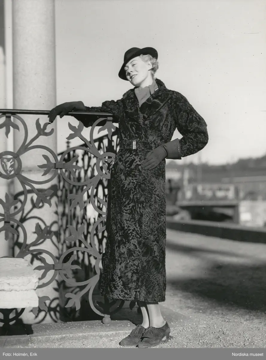 Nordiska Kompaniet. Exteriör. Kvinna i mörk pälskappa med brett skärp poserar vid ett järnräcke.