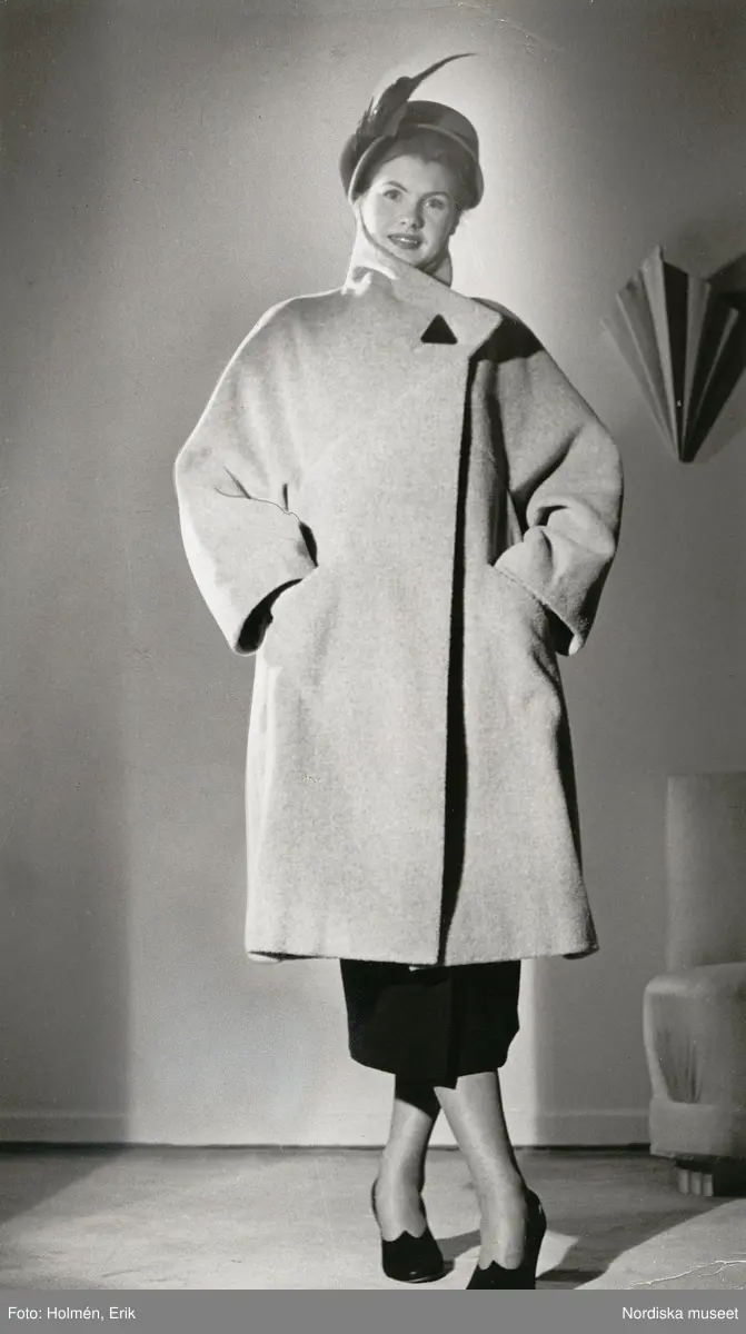Nordiska Kompaniet. Kvinna i ljus kappa med vida ärmar. Mörk kjol. Mörk hatt med fjäder. Bruyère. Text på baksidan: "Vi klä oss. September 1948"