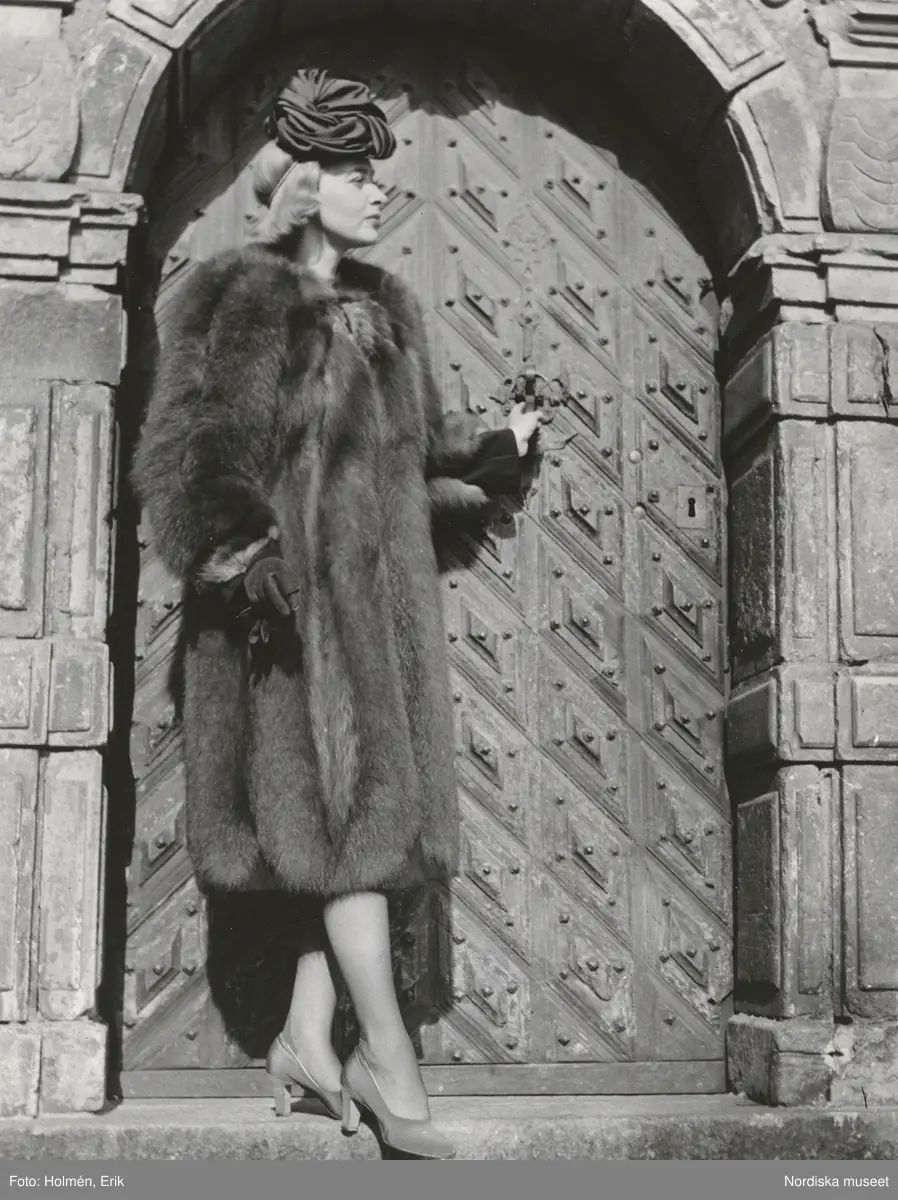 Nordiska Kompaniet. Kvinna i pälskappa och mörk hatt. Bakom henne en kyrkport.