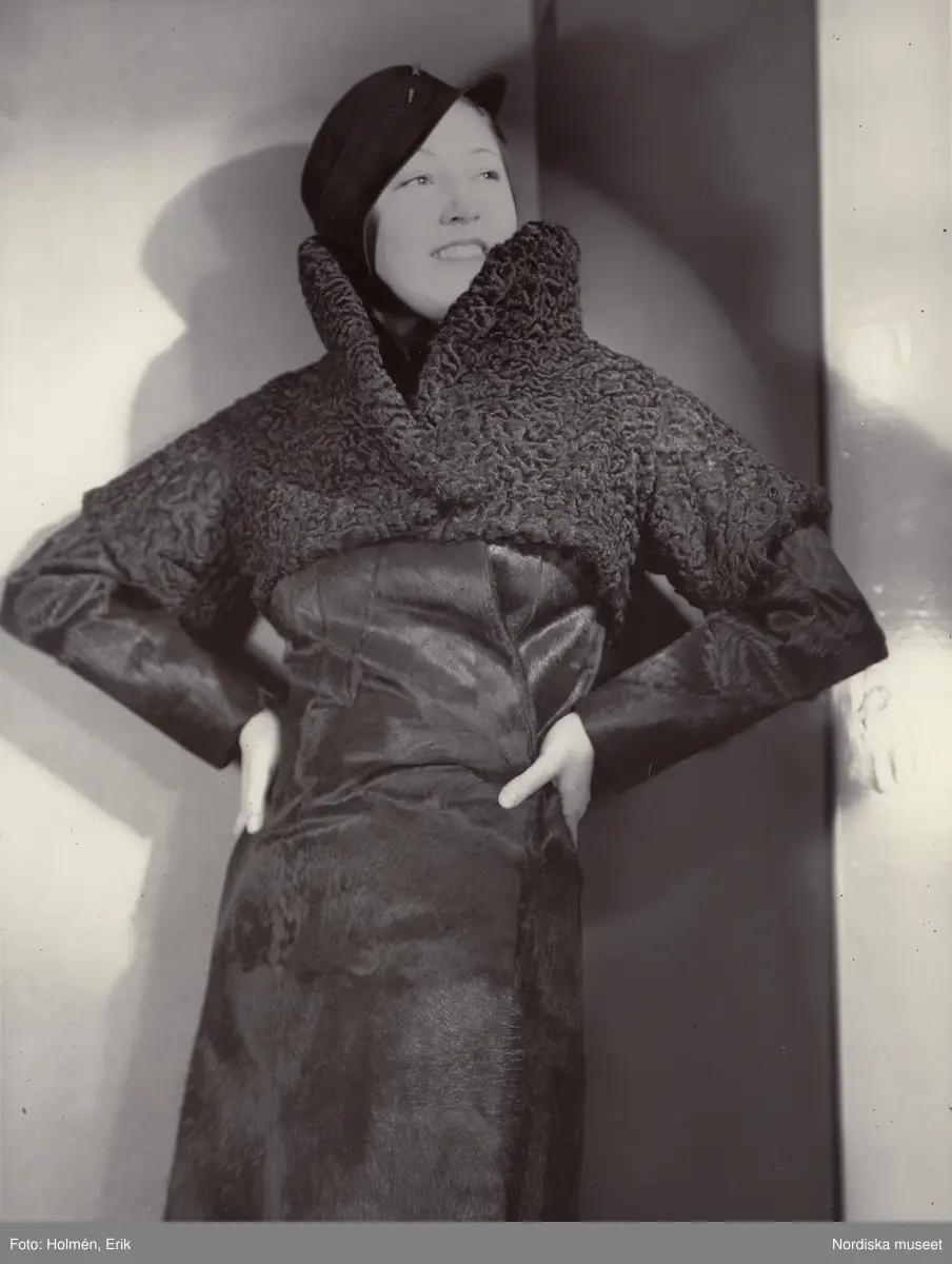 Nordiska Kompaniet. Kvinna i slät päls av fölskinn med överdel av persian. Text på baksiidan: "Pälsar år 1932. Brun föl med persian".
