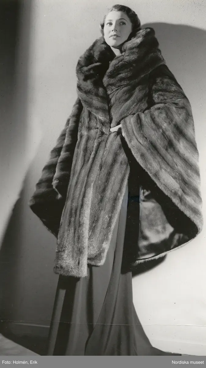 Nordiska Kompaniet. Kvinna i mörk aftonklänning och lång och vid cape av nertz. Text på baksidan: "Nertzcape (fru Wenner-Gren)"