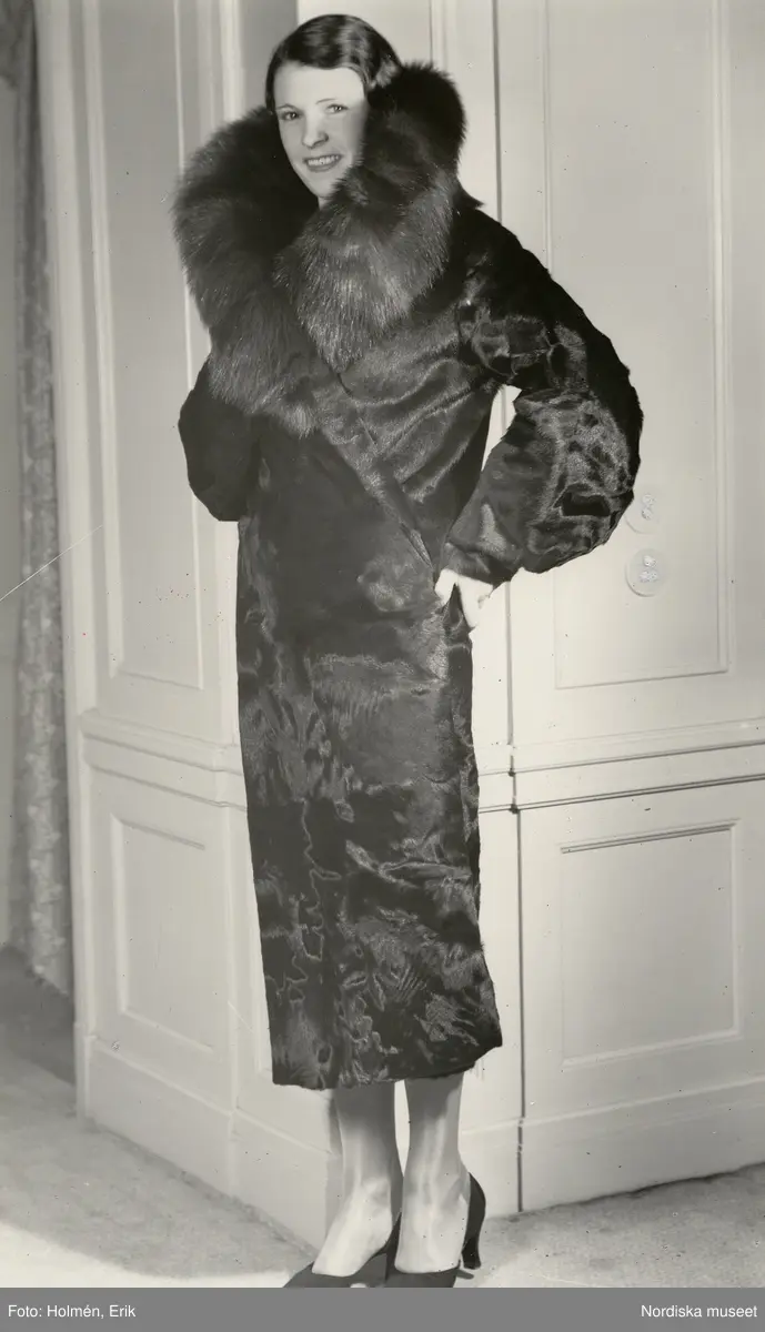 Nordiska Kompaniet. Kvinna i mörk pälskappa med hög och bred krage i avvikande päls. Text på baksidan: "Utlottn.pälsen, Ulriksdal okt. 1932"