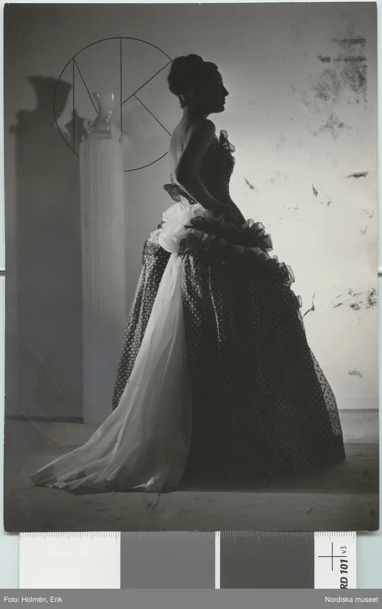 Nordiska Kompaniet. Kvinna i prickig aftonklänning med rysch i två rader samt baktill en vit isättning. Text på baksidan: Maggie Rouff".