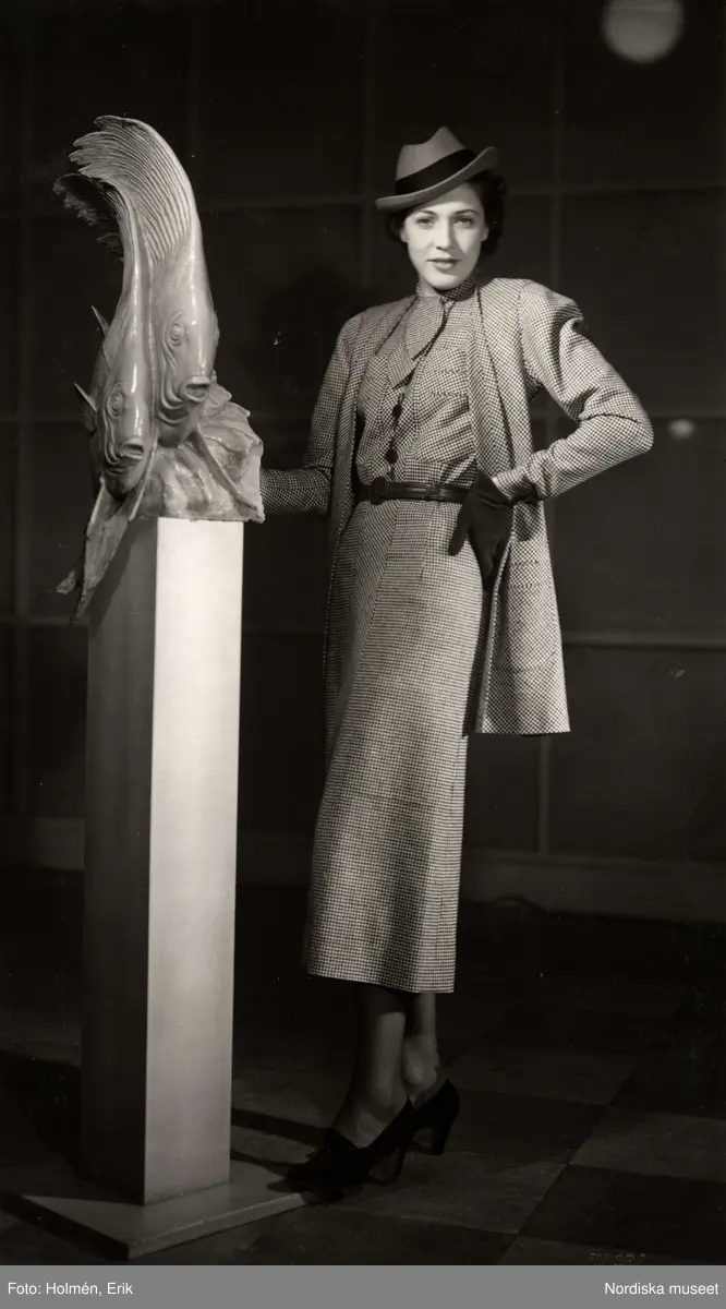 Dammode visas på varuhuset Nordiska Kompaniet i Stockholm 1937. En kvinnlig modell poserar iklädd dräkt brevid en skulptur i föreställande av två fiskar. Kjolen är vadlång, blusen har knytband, jackan är av ledig modell. Till detta bär hon herrhatt, handskar och pumps med klack.