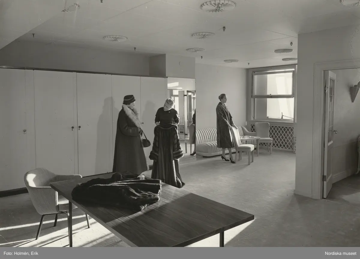 Nordiska Kompaniet, interiör. Modell visar upp en päls för en sittande kund. Text på baksidan:"dec 1956"