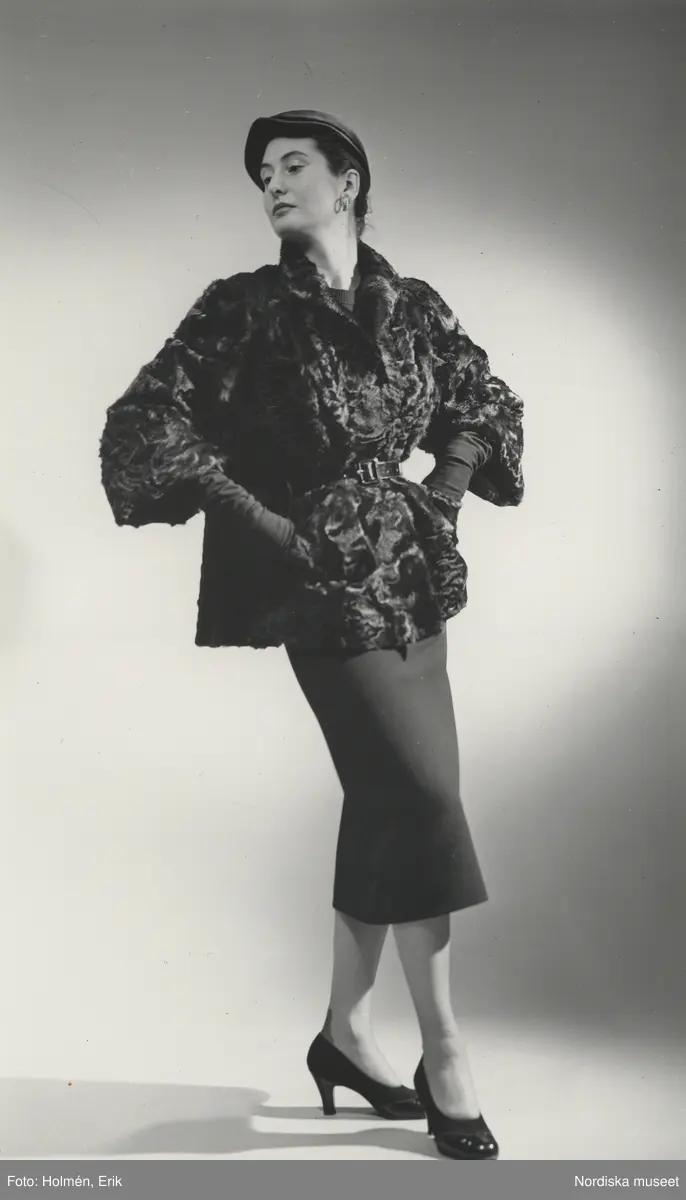 Nordiska Kompaniet. Kvinna i mörk pälsjacka med vida ärmar. Smalt skärp i midjan; mörk snäv kjol. Text på baksidan: "NK. Kid 1951"