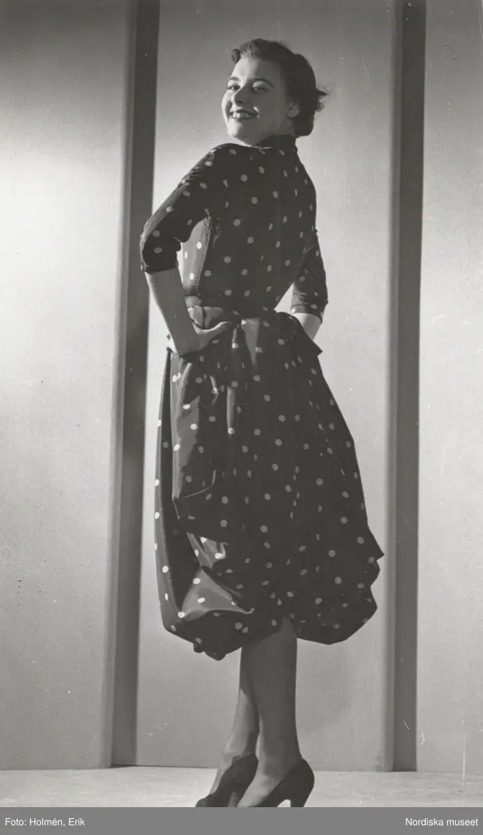 Nordiska Kompaniet. Kvinna i mörk klänning med ljusa prickar. Trekvartsärm, rynkad kjol. Text på baksidan: "Mars 1950"