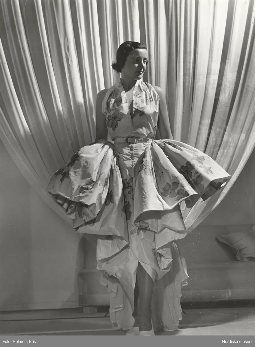 Nordiska Kompaniet. Kvinna i ärmlös aftonklänning med stort blommönster mot ljus botten. Stort arrangemang över höftpartiet. text på baksidan: "J. Griffe mars 1950"