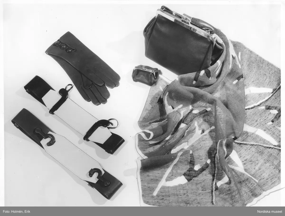 Kollage av accessoarer. Yllescarf med skidmotiv, avsedd för sport. Skinnskärp med pistoler i hölster samt hakar och hyskor. "Väskan är i nappa och visar den för säsongen karakteristiska breda botten. En lustig nyhet är portmonnän i exakt samma form som väskan."