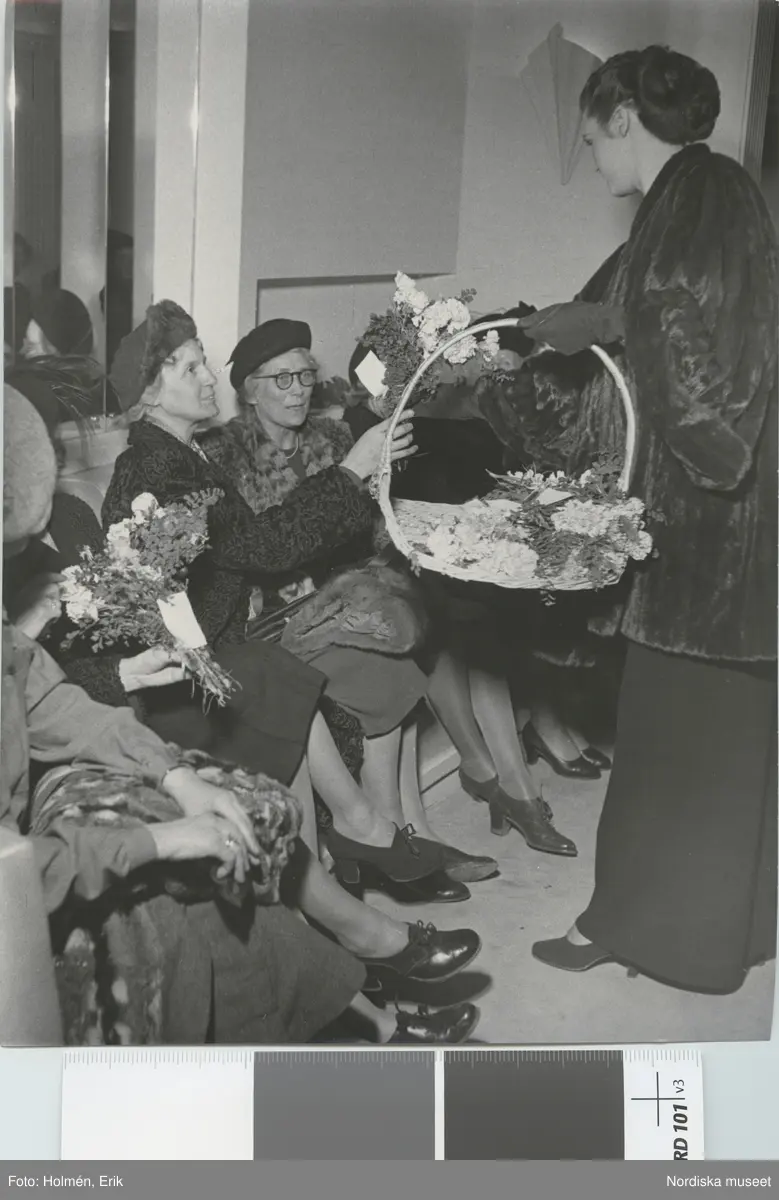 Modevisning Nordiska Kompaniet. Kvinna i lång, mörk klänning och päls med vida ärmar lämnar blombuketter till en sittande publik.