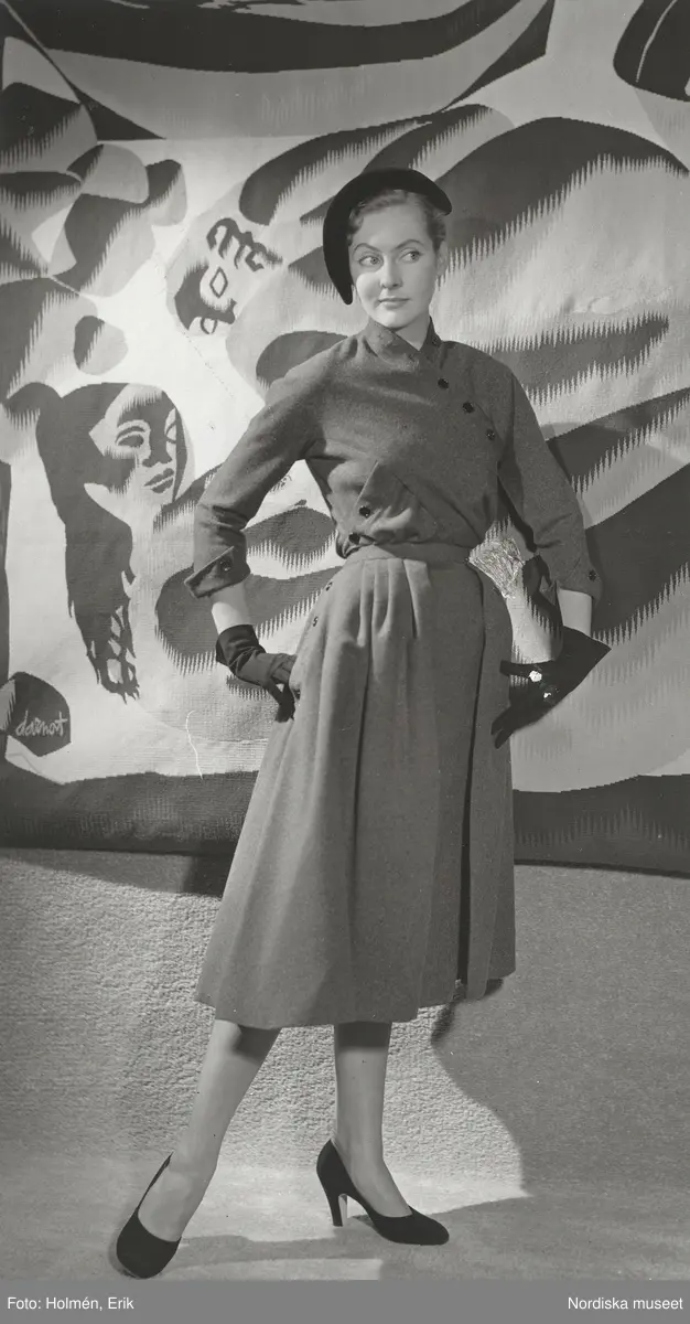 Modell i ylleklänning, hatt, handskar och pumps, framför textilkonstverk. Från Dior.