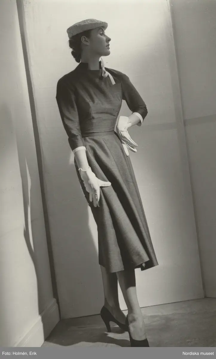 Modell i klänning med vit rosett, handskar och hatt i kepsmodell.